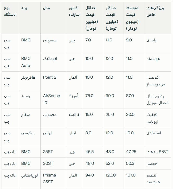 • دستگاه‌های سی پپ: محدوده قیمتی ۷ تا ۹۹ میلیون تومان با متوسط ۲۴.۷ میلیون تومان