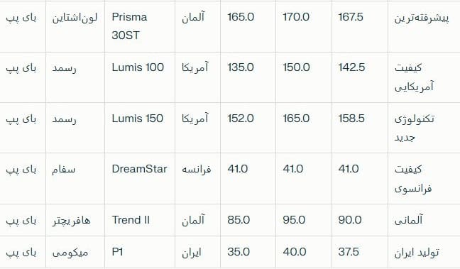 • دستگاه‌های بای پپ: محدوده قیمتی ۳۵ تا ۱۷۰ میلیون تومان با متوسط ۹۳.۵ میلیون تومان